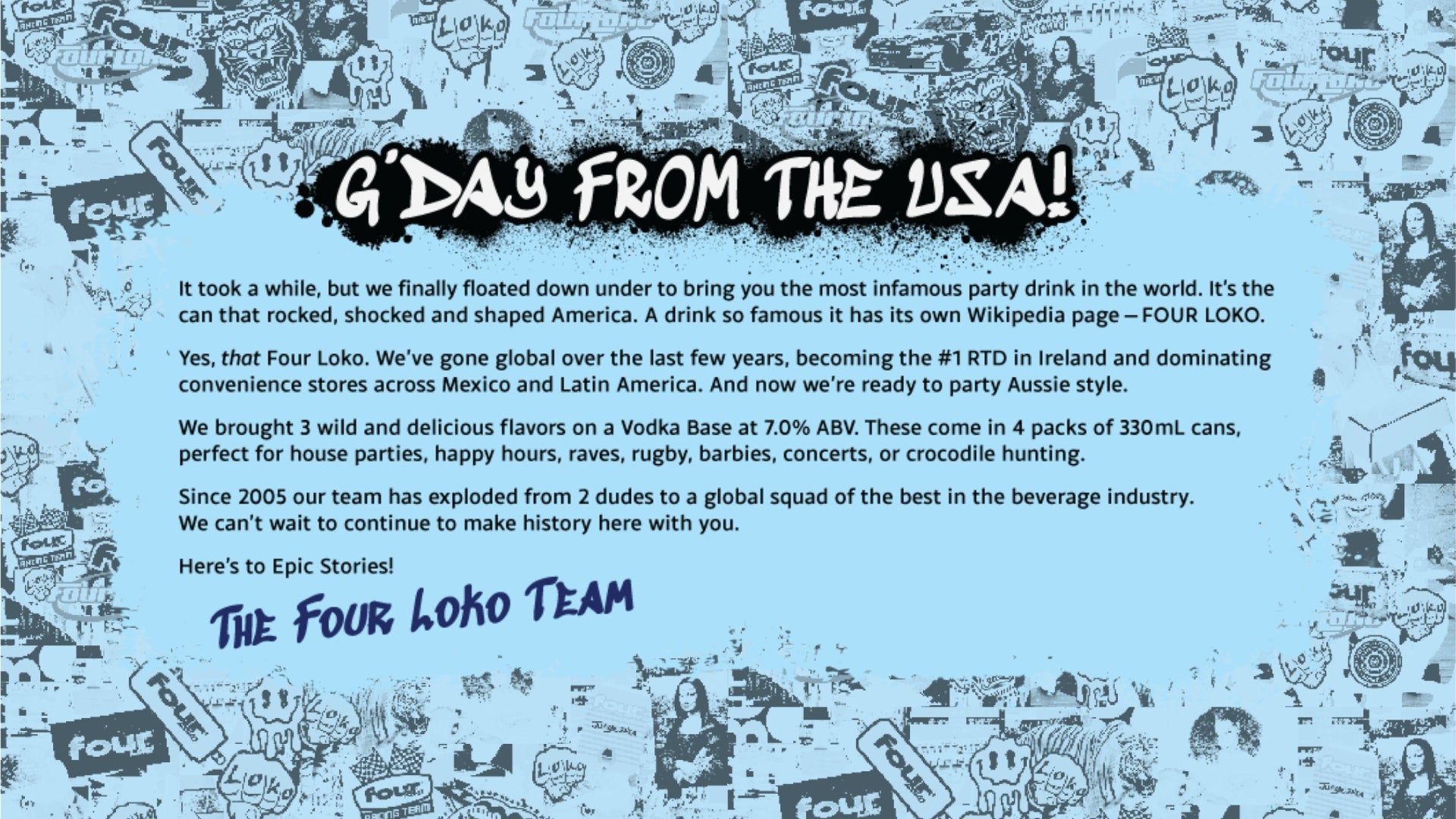From the very beginning, the Four Loko journey has been one of relentless creativity. What started as a bold idea among friends and a small business loan has grown into a global brand. Four Loko Stories are being made in 35 different countries worldwide.
